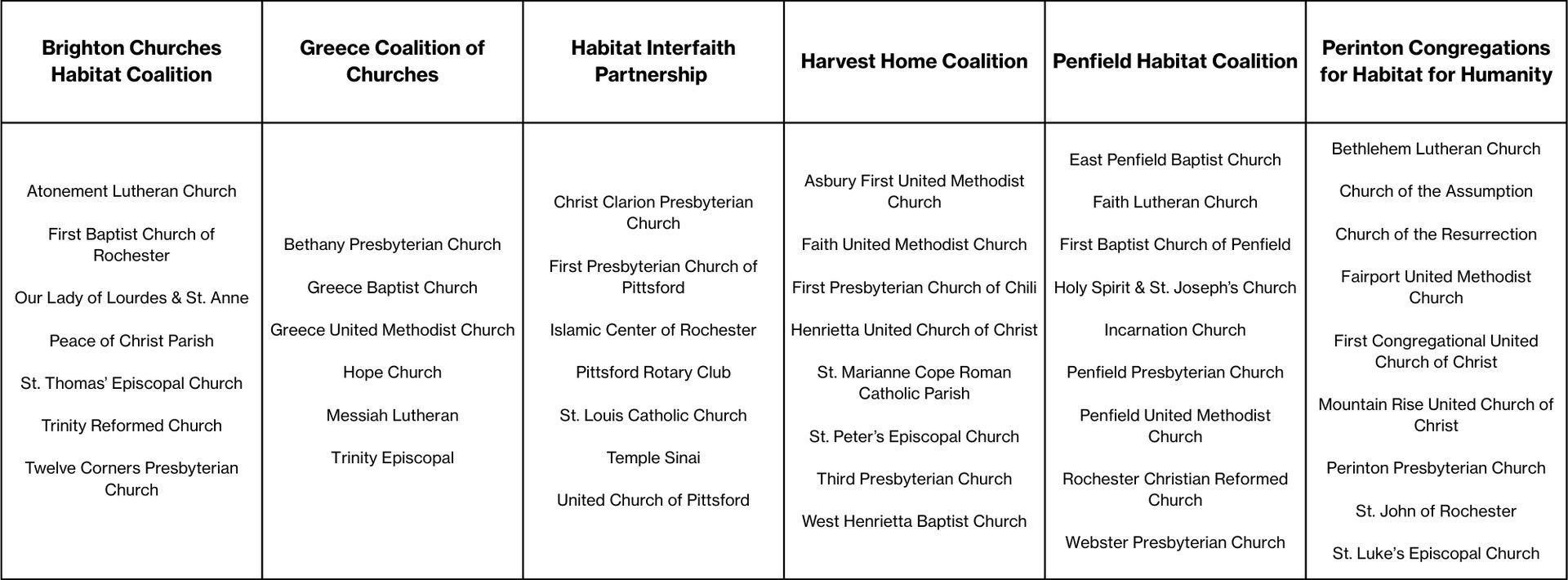 GRIB is a coalition of six faith-based groups: Perinton, Penfield, Greece, Brighton, Harvest Home/Henrietta, and Habitat Interfaith Partnership/Pittsford. As a coalition, they work to transform lives and promote positive, lasting social, economic, and spiritual change in our community. By fostering mutual trust and shared goals, they demonstrate the power of responsible stewardship and collaborative action in making a real difference.